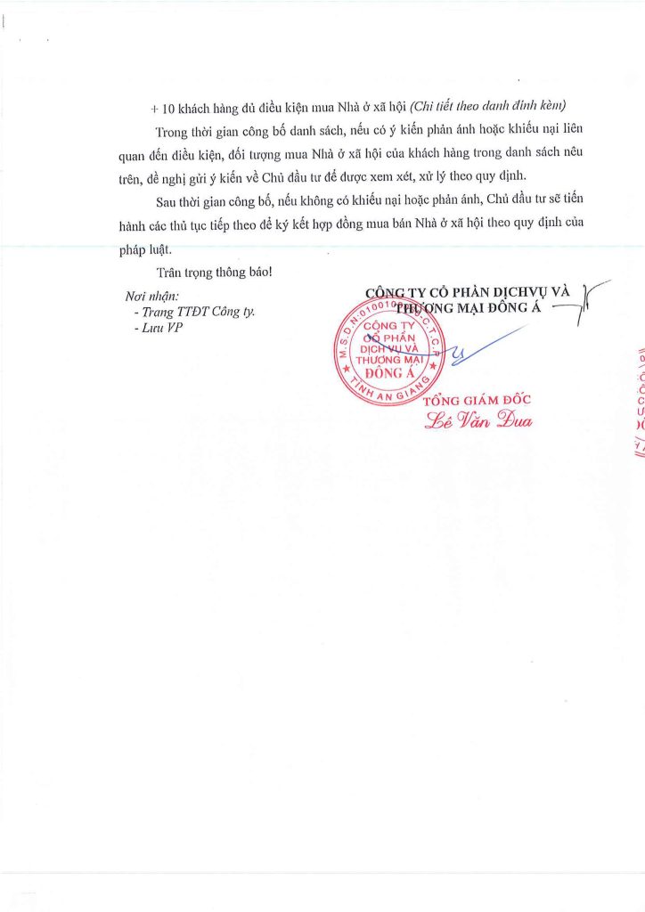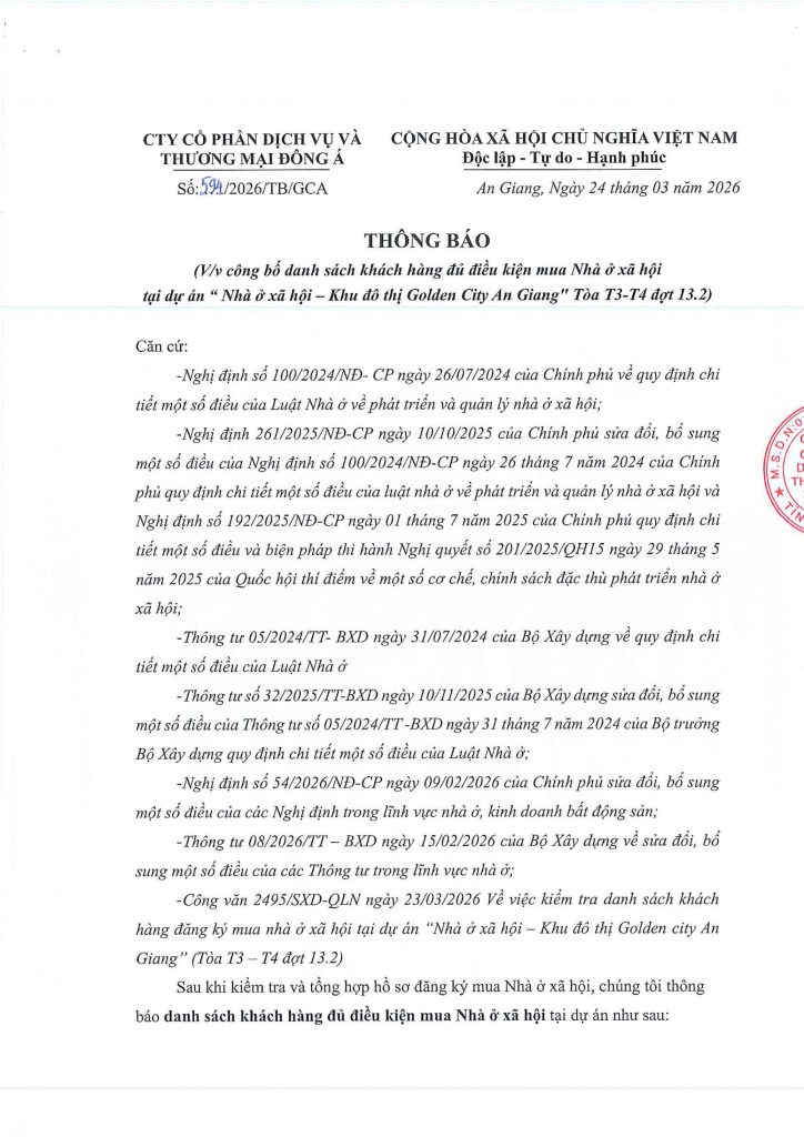 Công ty Cổ phần Dịch vụ và Thương mại Đông Á – Chủ đầu tư dự án “Nhà ở xã hội – KĐT Golden City An Giang” tòa T3, T4 công bố Danh sách khách hàng đủ điều kiện mua NOXH tại dự án “Nhà ở xã hội – KĐT Golden City An Giang” Tòa T3-T4 đợt 13